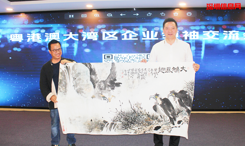 鹏城荟品牌出海服务中心顾问、著名书画家左禅老师为中心赠送书法,并为关鹏先生赠送画作。
