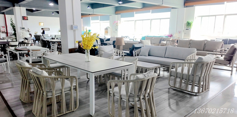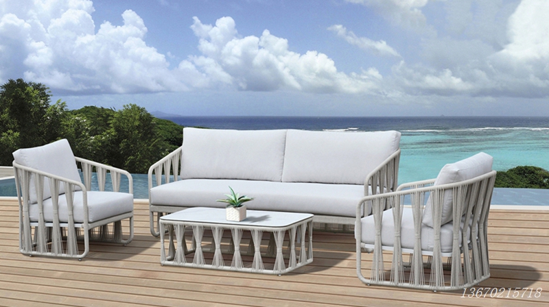 户外沙发组合(三人沙发+ 2单人椅+茶几):模块化设计可灵活调整布局,高密度防水海绵坐垫坐感柔软,亲肤面料快速风干;配套绳编茶几边缘圆润安全,适配海景露台、花园聊天区等场景,为休闲放松提供轻奢空间。(vx:zjh243415517)
