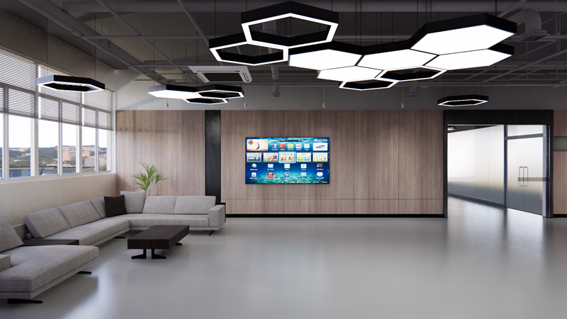 在空间设计上,充分运用现代科技感“太空”元素,垂直与横向,六角蜂窝状灯饰,有大同也有小异,阴阳互补,充分提升商业空间的明亮时尚与通透感。“灰+黑”搭配的软装主调,让这种商业氛围更显大气、极简。