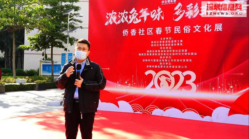 辞旧迎新展希望,欢声笑语话祥年。为弘扬传统民俗文化,促进非遗文化传承,和谐邻里关系,营造新时代文明和谐的春节新风尚。2023年1月18日下午,由深圳市福田区香蜜湖街道党工委主办、福田区香蜜湖街道侨香社区党委承办的民生微实事项目“浓浓兔年味,多彩非遗荟”侨香社区春节民俗文化展在侨香社区党群服务中心广场举行。社区居民欢聚一堂,用体验传统民俗文化的形式迎接新春佳节的到来。