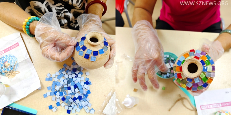活动现场,色彩斑斓的马赛克碎片、形态古色的创意瓶子以及专业的指导工具一应俱全,为长者们提供了一个尽情发挥创意的平台。