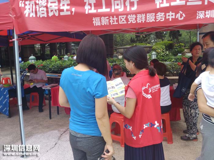 深圳信息网消息(通讯员 劳慧文)2019年6月19日,福新社区党群服务中心携手医院的医疗团队在黄埔雅苑一期广场开展了一场以“和谐民生,社工同行”社工宣传活动。