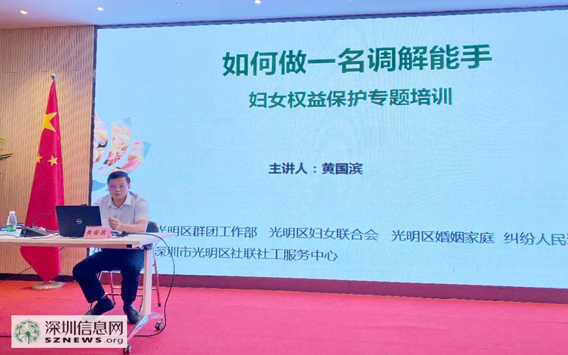 深圳信息网11月6日消息(通讯员 黄小芳 孟令芳) 11月5日下午,由光明区群团工作部、光明区妇女联合会、光明区婚姻家庭纠纷人民调解委员会联合主办,深圳市光明区社联社工服务中心承办的“如何做一名调解能手”妇女权益保护专题培训在光明区党群服务中心新时代大讲堂开展。此次培训主要是为了提升光明区基层工作人员的调解业务水平,维护光明区妇女儿童的权益。