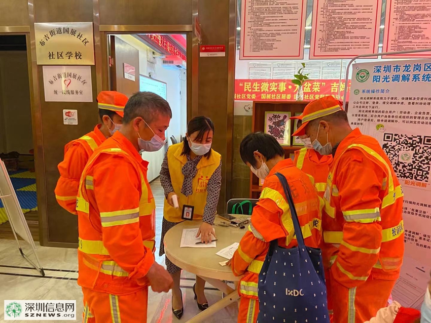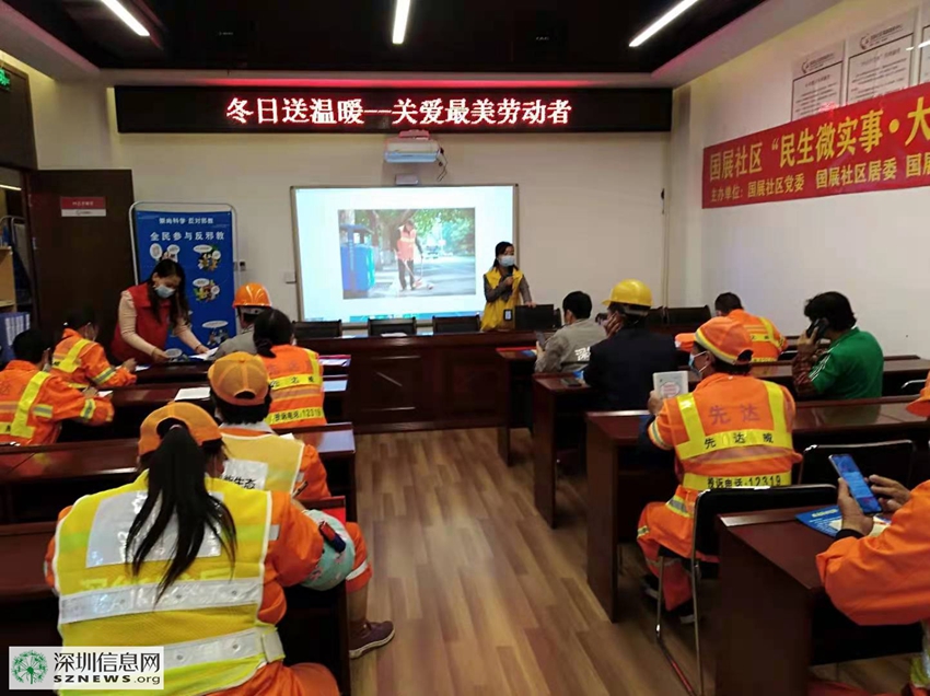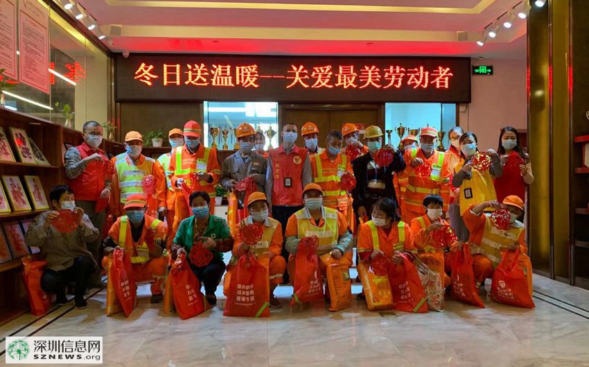 深圳信息网12月29日消息(通讯员 荚禾芸 )12月29日上午,在人力资源局、布吉街道经济服务办的指导下,社联驻龙岗区和谐劳动关系项目社工联合国展社区党委、龙岗区文化馆布吉街道国展社区文化指导员组织布吉街道辖区20余名环卫工人在国展社区党群服务中心开展以“冬日送温暖·关爱最美劳动者”为主题的关爱活动。为他们送上节日的祝福、关爱与慰问,感谢他们为辖区整洁的环境做出贡献。