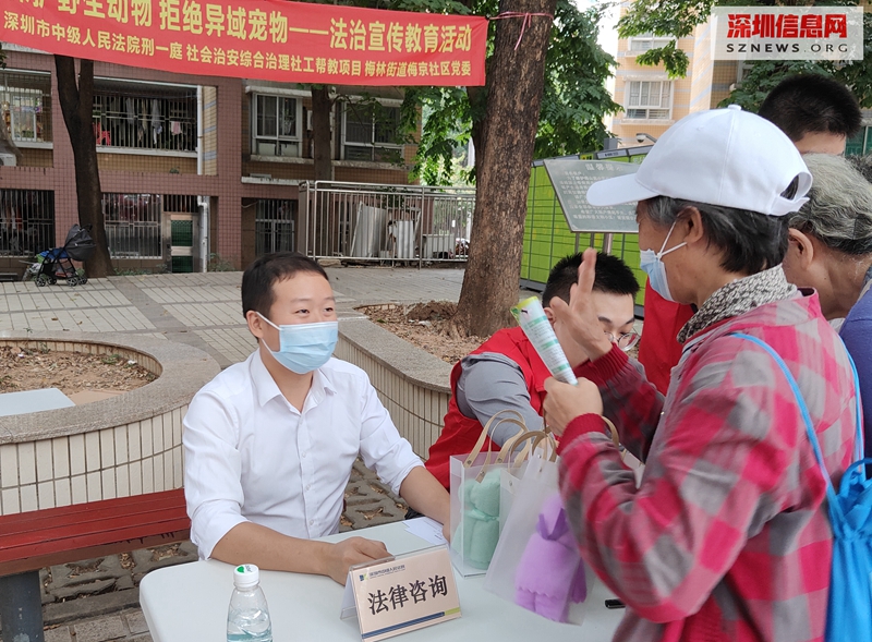 为进一步加强深圳市居民对豢养异域宠物危害的认知,促进居民良好的公民行为习惯养成,营造良好的社区宠物豢养秩序和环境,2021年11月19日下午,深圳市中级人民法院刑一庭联合深圳市社联社工服务中心、深圳市梅林街道梅京社区党委在福田区梅山苑一号广场开展了“保护野生动物 拒绝异域宠物”——法治宣传活动。本次活动是深圳中级人民法院刑一庭“我为群众办实事”活动中的一场,共吸引了近100多名社区居民参加。