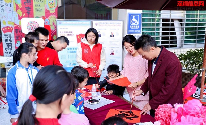 尤为引人注目的是,宝安区书法家协会副主席熊渊博老师亲临现场,挥毫泼墨。 这一环节超越了简单的赠予,成为一场高雅艺术走入寻常百姓家的生动示范。熊老师笔下的每一副春联、每一个“福”字,不仅传递着墨香祝福,更象征着专业艺术力量对社区文化建设的倾情注入,体现了新时代文明实践站联结优质资源、提升服务品质的桥梁作用。